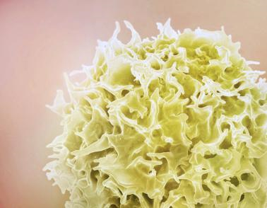 Colorized scanning electron micrograph of a T cell (yellow).