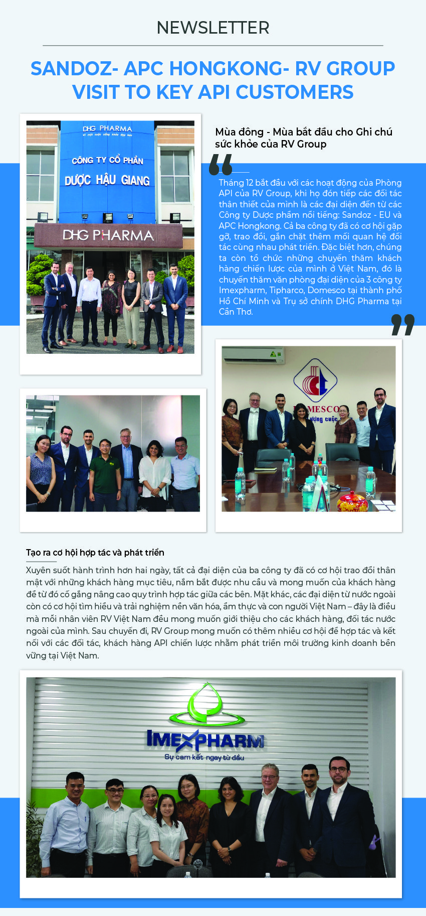 Tháng 12 bắt đầu với các hoạt động của Phòng API của RV Group, khi chúng ta đón tiếp các đối tác thân thiết của mình là các đại diện đến từ các Công ty Dược phẩm nổi tiếng: Sandoz - EU và APC Hongkong. Cả ba công ty đã có cơ hội gặp gỡ, trao đổi, gắn chặt thêm mối quan hệ đối tác cùng nhau phát triển. Đặc biệt hơn, chúng ta còn tổ chức những chuyến thăm khách hàng chiến lược của mình ở Việt Nam, đó là chuyến thăm văn phòng đại diện của 3 công ty Imexpharm, Tipharco, Domesco tại thành phố Hồ Chí Minh và Trụ sở chính DHG Pharma tại Cần Thơ.