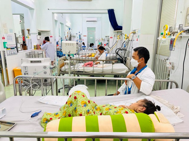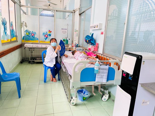 BSCKI Trần Ngọc Lưu cho biết, Khoa Hồi sức bệnh nhiễm và COVID-19 của Bệnh viện có hơn 150 ca, trong đó đã có hơn 130 ca mắc tay chân miệng. Bệnh viện bố trí giường xếp, tận dụng khoảng trống hành lang của Khoa để bệnh nhân nằm, cố gắng đảm bảo mỗi bé một giường, tránh việc nằm giường đôi, giường ba.
